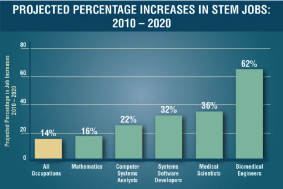 As you can see in the charts below, the number of STEM jobs are increasing. However the number of students going on to college in a STEM related career are not keeping pace with the need. That's where our club can impact the numbers of kids exposed to STEM via FIRST Robotics.